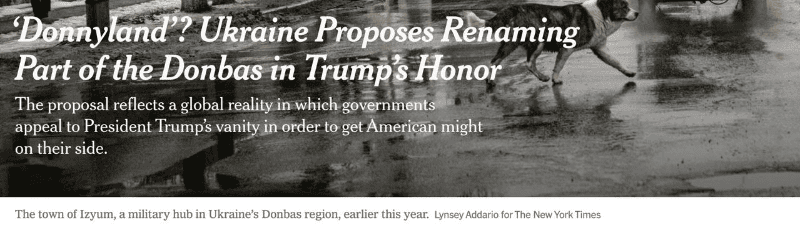 Ali najnevjerovatniji primjer da je ime predsjednika Trumpa posuđeno geopolitičkoj tački žarišta mogao bi biti onaj koji je do sada ostao izvan javnosti. U mirovnim pregovorima u Ukrajini posljednjih mjeseci, ukrajinski zvaničnici sugerirali su da bi se dio Donbasa, za koji se Rusija još uvijek bori, mogao nazvati “Donnyland“.