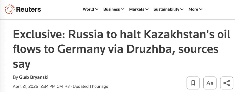 - Rusija namjerava zaustaviti izvoz nafte iz Kazahstana u Njemačku putem naftovoda Družba počevši od 1. maja.