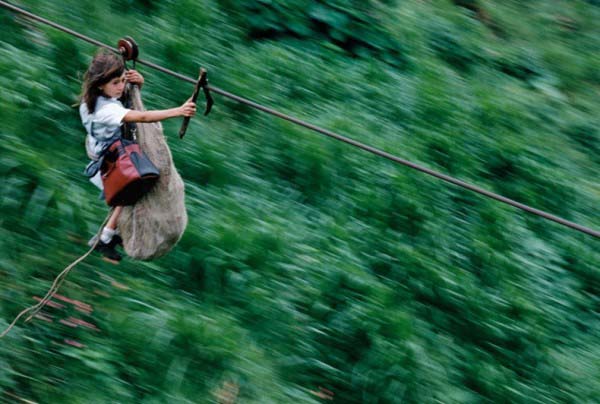 Kada se pravi mostovi sruše od poplava ili starosti, djeca moraju hodati po užetu poput ovoga.